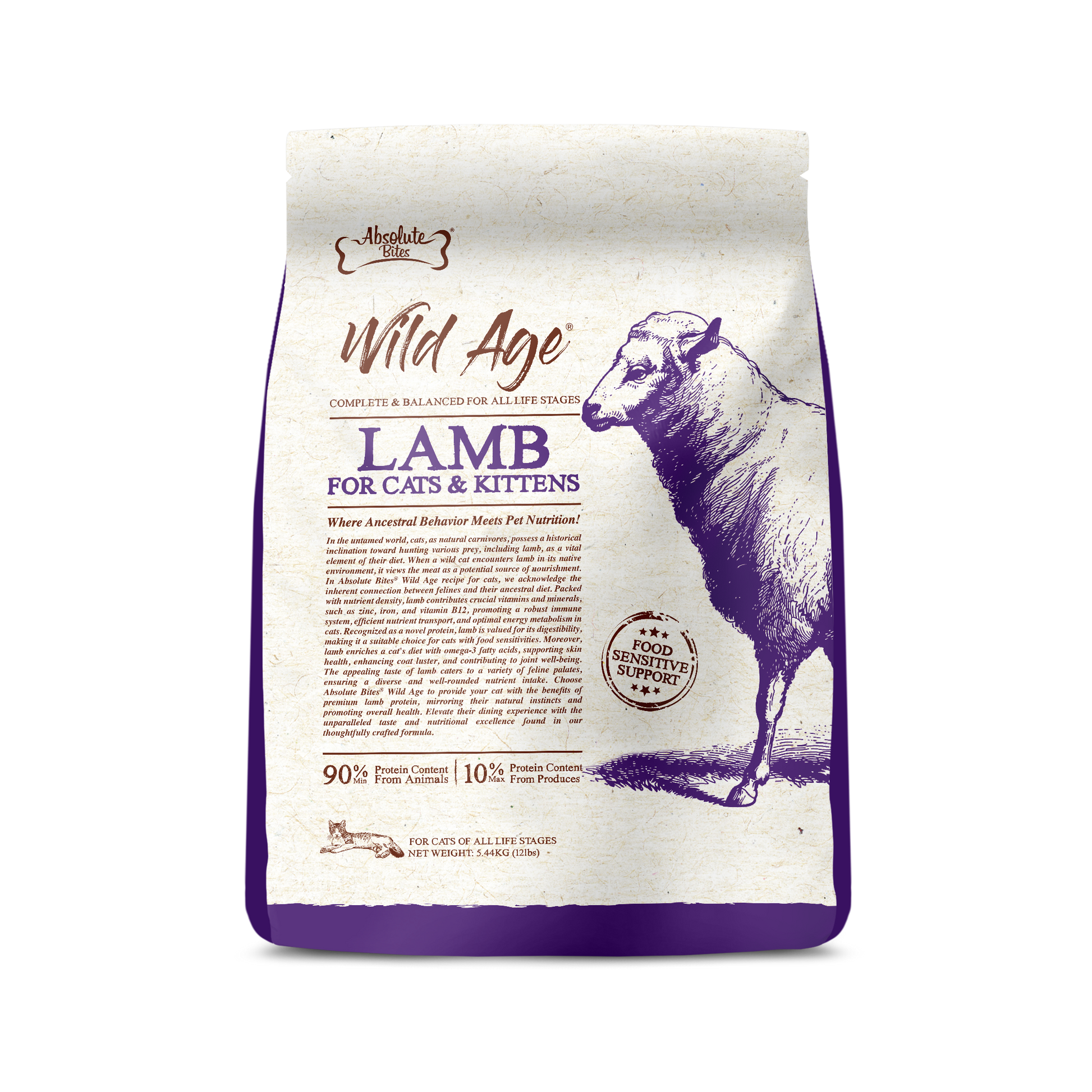 In the untamed world, cats, as natural carnivores, possess a historical inclination toward hunting various prey, including lamb, as a vital element of their diet. When a wild cat encounters lamb in its native environment, it views the meat as a potential source of nourishment. In Absolute Bites® Wild Age recipe for cats, we acknowledge the inherent connection between felines and their ancestral diet. Packed with nutrient density, lamb contributes crucial vitamins and minerals, such as zinc, iron, and vitamin B12, promoting a robust immune system, efficient nutrient transport, and optimal energy metabolism in cats. Recognized as a novel protein, lamb is valued for its digestibility, making it a suitable choice for cats with food sensitivities. Moreover, lamb enriches a cat's diet with omega-3 fatty acids, supporting skin health, enhancing coat luster, and contributing to joint well-being. The appealing taste of lamb caters to a variety of feline palates, ensuring a diverse and well-rounded nutrient intake. Choose Absolute Bites® Wild Age to provide your cat with the benefits of premium lamb protein, mirroring their natural instincts and promoting overall health. Elevate their dining experience with the unparalleled taste and nutritional excellence found in our thoughtfully crafted formula.