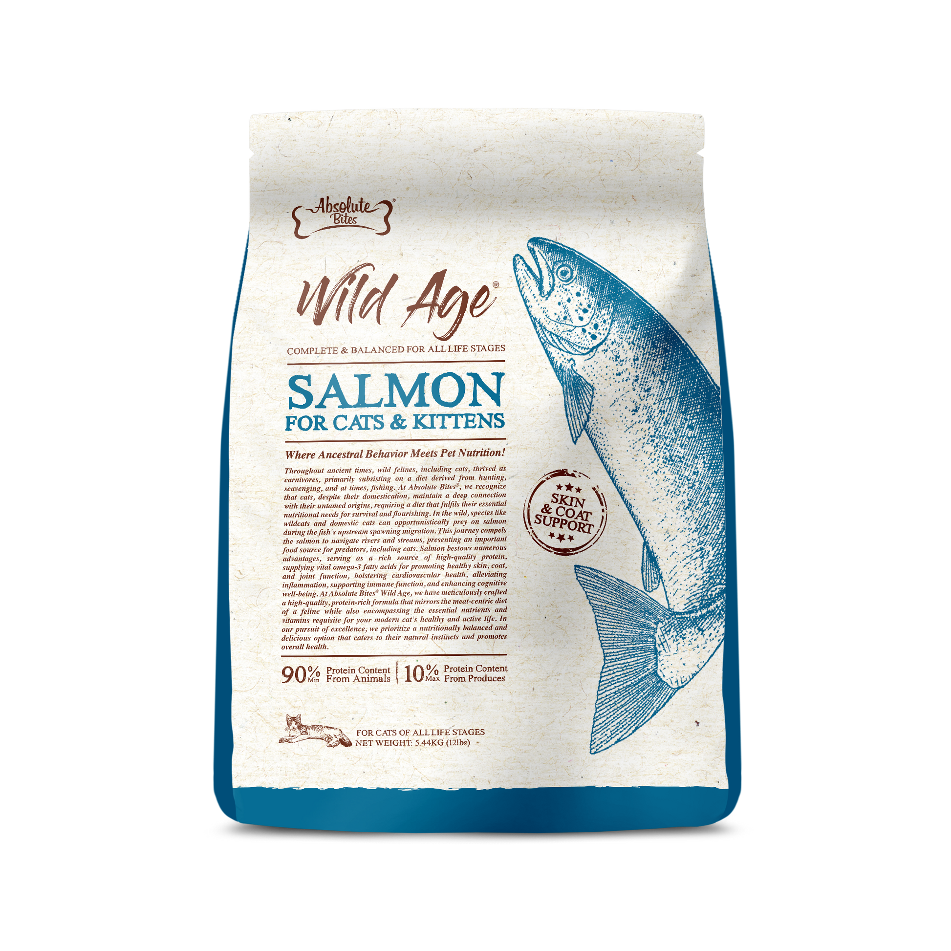 Throughout ancient times, wild felines, including cats, thrived as carnivores, primarily subsisting on a diet derived from hunting, scavenging, and at times, fishing. At Absolute Bites®, we recognize that cats, despite their domestication, maintain a deep connection with their untamed origins, requiring a diet that fulfils their essential nutritional needs for survival and flourishing. In the wild, species like wildcats and domestic cats can opportunistically prey on salmon during the fish's upstream spawning migration. This journey compels the salmon to navigate rivers and streams, presenting an important food source for predators, including cats. Salmon bestows numerous advantages, serving as a rich source of high-quality protein, supplying vital omega-3 fatty acids for promoting healthy skin, coat, and joint function, bolstering cardiovascular health, alleviating inflammation, supporting immune function, and enhancing cognitive well-being. At Absolute Bites® Wild Age, we have meticulously crafted a high-quality, protein-rich formula that mirrors the meat-centric diet of a feline while also encompassing the essential nutrients and vitamins requisite for your modern cat's healthy and active life. In our pursuit of excellence, we prioritize a nutritionally balanced and delicious option that caters to their natural instincts and promotes overall health.