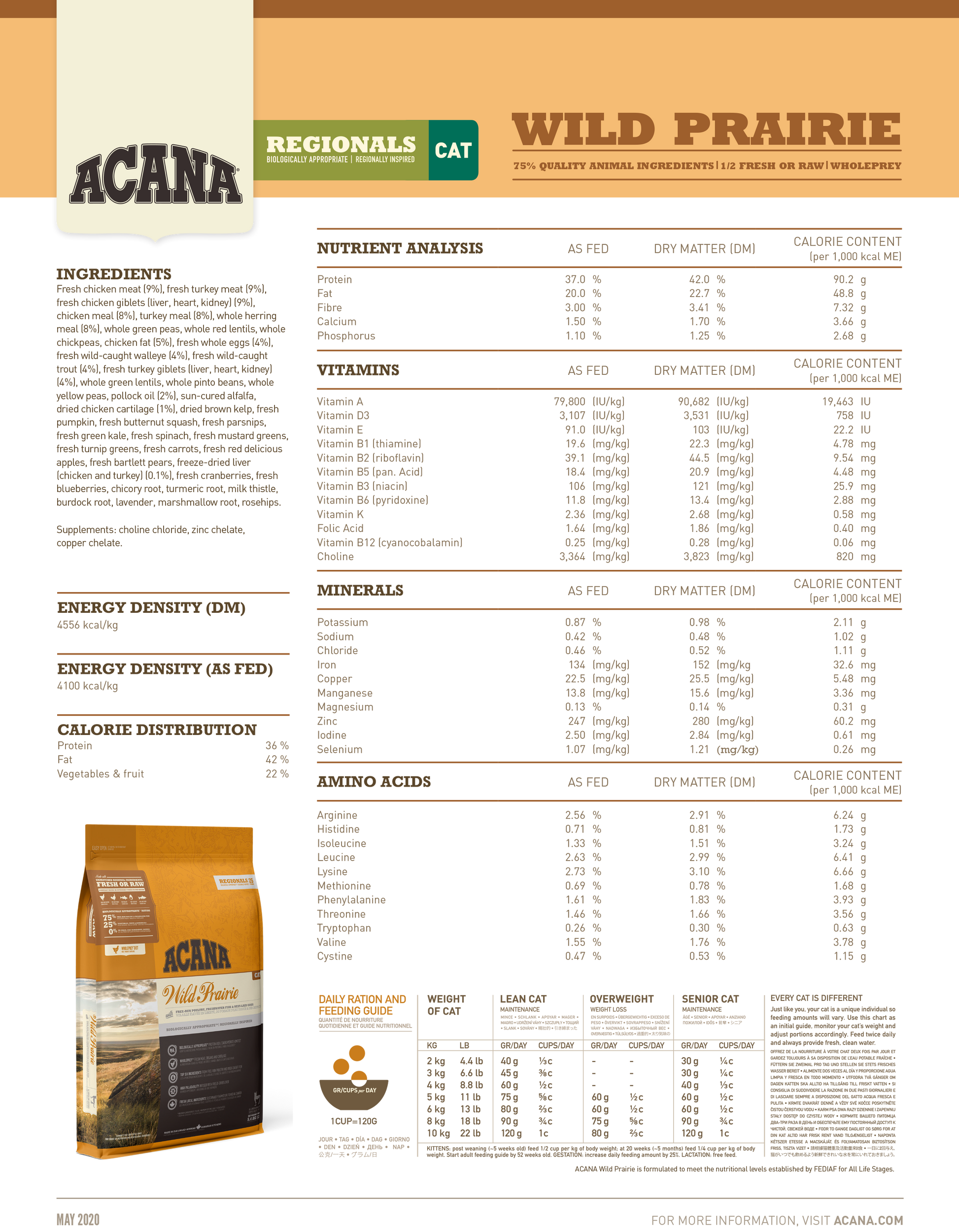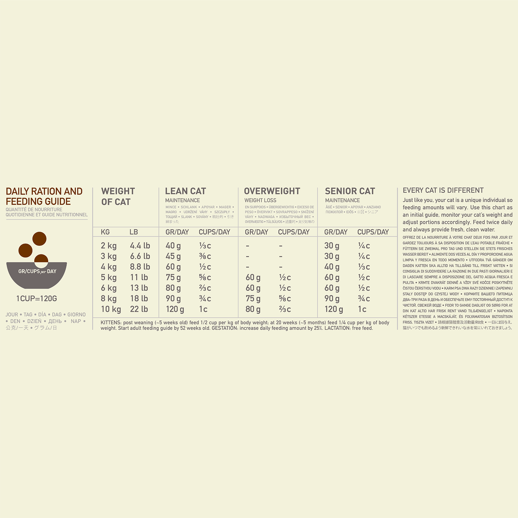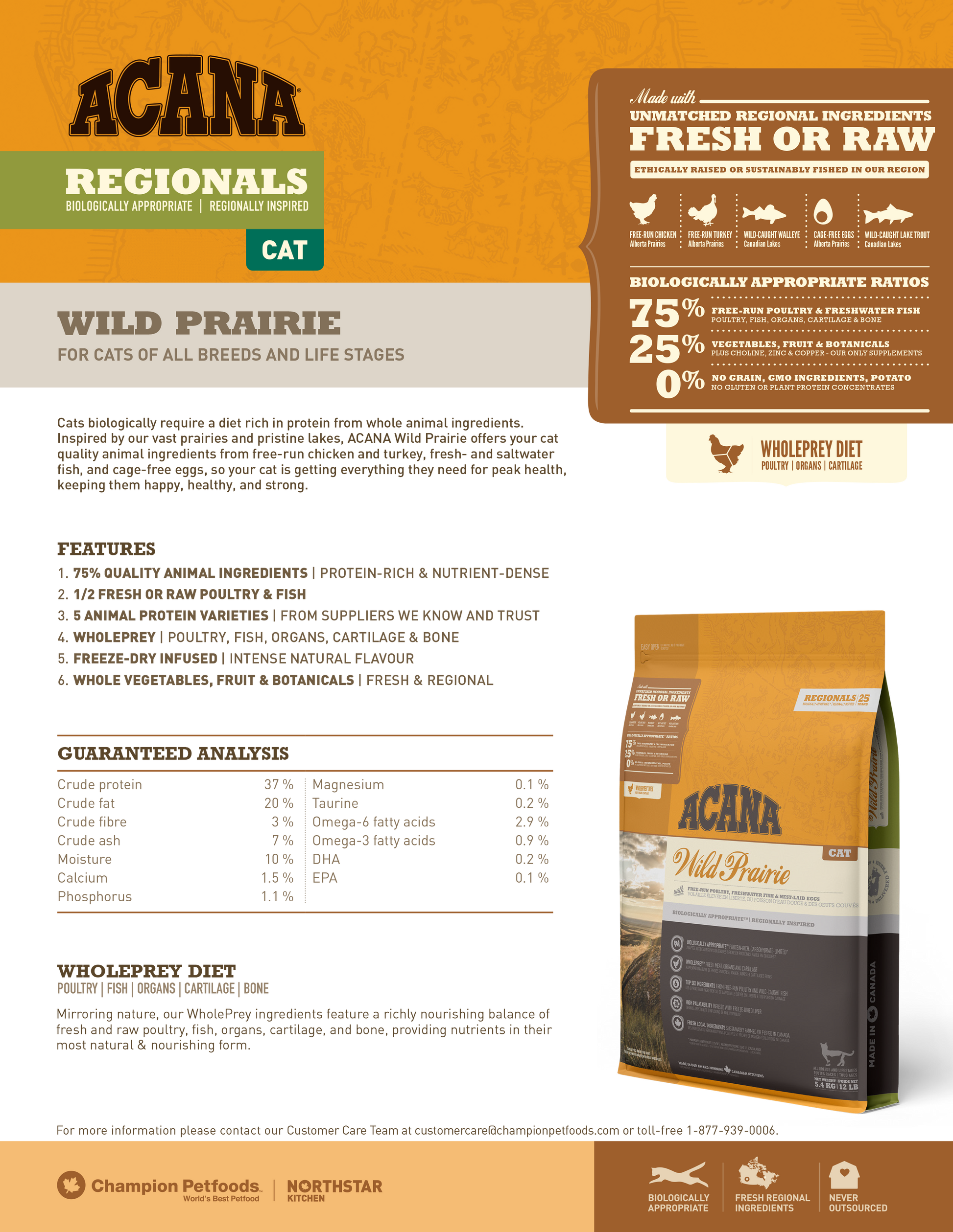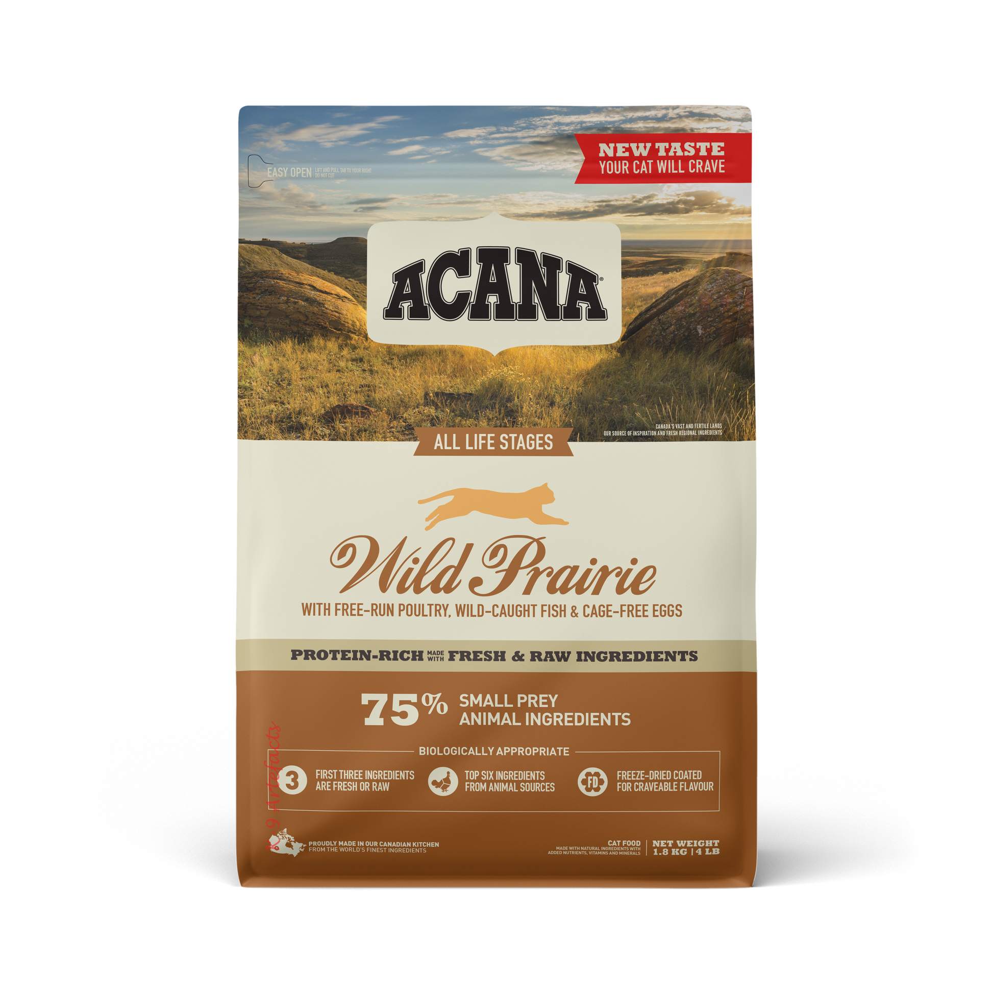Rich with the highest level of animal protein, our ACANA™ Wild Prairie Cat Recipe will satisfy your cat completely with its rich poultry ingredients and flavor. Crafted with 75% animal ingredients including free-run chicken and turkey, and chicken liver, this recipe provides your cat with a variety of nourishing animal protein. This nutrient-dense recipe also helps support key health benefits including your cat’s digestive health, healthy skin & coat, and healthy heart & eyes. Nurture your feline completely with the rich animal protein and nutrition in ACANA Wild Prairie Cat Recipe!