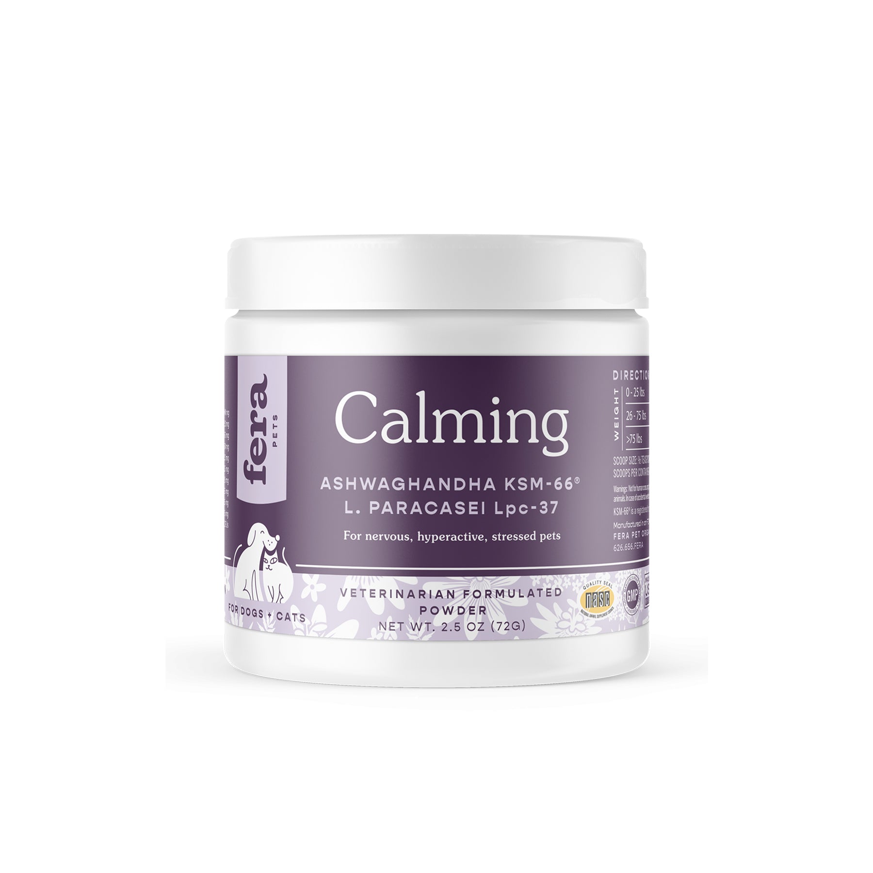 Fera Pets Calming Support Supplement for Cats and Dogs features effective ingredients to promote relaxation for nervous, hyperactive or stressed pets. This custom combination of herbs, amino acids, neurotransmitters and probiotics, were chosen for their synergy and effectiveness for calmness.