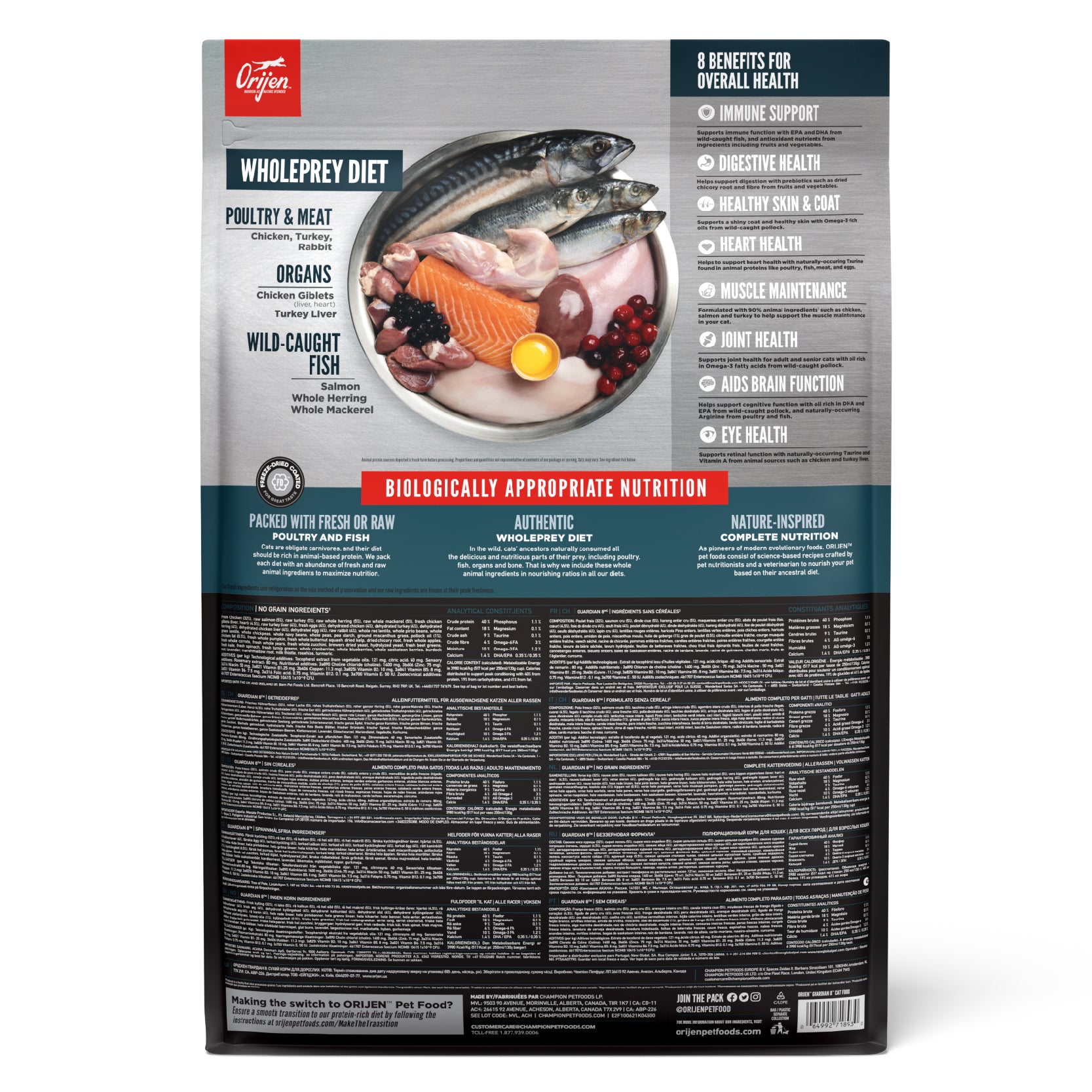 ORIJEN® Guardian 8 is a nourishing food specially formulated to address 8 common cat concerns through quality ingredients. Because of the abundance of fresh and raw WholePrey animal ingredients in this diet, less supplementation is needed to support your cat’s health for a lifetime. With 90% premium animal ingredients, and 2/3 of those being fresh and raw, Guardian 8 contains nutritious ingredients that help support your cat’s overall health with 8 benefits. These benefits include Immune support, Digestive health support, Healthy skin & coat support, Muscle maintenance, Heart health, Joint health, Brain & cognitive function, and Eye health.