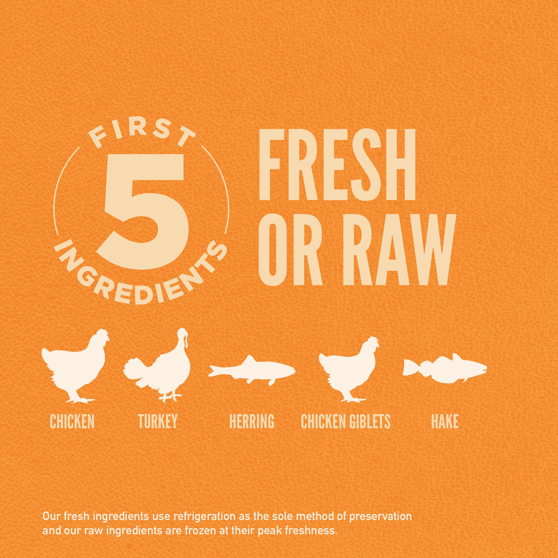Help your cat thrive with the power of protein-rich recipes that provide peak nourishment. As obligate carnivores, modern cats are built like their ancestors and thrive on a biologically appropriate diet rich in protein and fat sourced from a variety of animal ingredients. ORIJEN® Original Cat diet is made with fresh or raw free-run chicken and turkey and wild-caught fish. Packed with WholePrey animal ingredients like poultry, fish, organs and bone, ORIJEN Original Cat diet is made with the most nutrient-dense, succulent parts of the prey to deliver the nutrition cats need. With 85% quality animal ingredients and a freeze-dried liver coating, this diet is beyond comparison.
