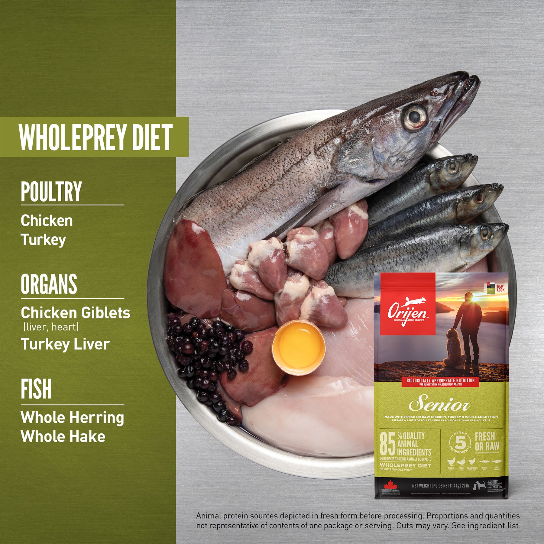 Help your dog thrive with the power of protein-rich recipes that provide peak nourishment. Dogs are ancestral carnivores, so they need a Biologically Appropriate diet rich and varied in whole animal ingredients. ORIJEN® Senior diet is crafted specifically for your senior dog to help them stay healthy by supporting lean muscle mass and weight maintenance. Packed with WholePrey animal ingredients like organs and bone, ORIJEN food is made with the most nutrient-dense, succulent parts of the prey to deliver the nutrition dogs need. With 85% quality animal ingredients and a freeze-dried liver coating, this diet is beyond comparison.